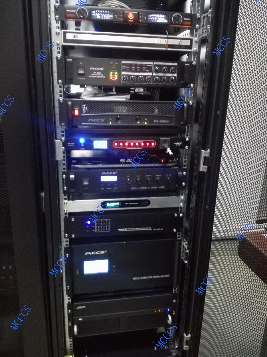 本項(xiàng)目使用了大量MCCS音視美產(chǎn)品,智能中控MC-PROiii、表決型會議手拉手話筒H8000B/H801A/H801B、高清無縫混合矩陣SC-HD1616S、功放FA200、音箱C-8L、無線話筒MG8580、電源控制器SC-P801等設(shè)備